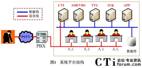 圖1是系統(tǒng)的技術(shù)平臺(tái)架構(gòu)圖。電話通過(guò)PSTN公用電話網(wǎng)進(jìn)入系統(tǒng),IVR服務(wù)與來(lái)電者自動(dòng)語(yǔ)音交互,來(lái)電者用語(yǔ)音說(shuō)出想要的路政分局的名稱,系統(tǒng)ASR服務(wù)正確識(shí)別后將來(lái)電轉(zhuǎn)到相應(yīng)的路政分局,由相應(yīng)路政分局提供服務(wù)。來(lái)電者在上班時(shí)間也可以請(qǐng)求人工座席服務(wù)。