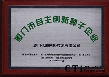 根據(jù)國(guó)家科技部、國(guó)務(wù)院國(guó)資委和全國(guó)總工會(huì)三部委制定的“創(chuàng)新型企業(yè)試點(diǎn)工作實(shí)施方案”和廈門(mén)市“技術(shù)創(chuàng)新引導(dǎo)工程實(shí)施方案”具體要求,市科技局、市國(guó)資委、市總工會(huì)、市財(cái)政局、市經(jīng)發(fā)局聯(lián)合開(kāi)展了2010年廈門(mén)市自主創(chuàng)新示范、試點(diǎn)、種子企業(yè)評(píng)選工作。經(jīng)專(zhuān)家評(píng)審和市五部門(mén)聯(lián)合審核后,廈門(mén)億聯(lián)網(wǎng)絡(luò)技術(shù)有限公司(以下簡(jiǎn)稱(chēng)億聯(lián))憑借科技、環(huán)保的產(chǎn)品和強(qiáng)大的研發(fā)實(shí)力獲得了廈門(mén)市自主創(chuàng)新種子企業(yè)獎(jiǎng)。CTI論壇報(bào)道