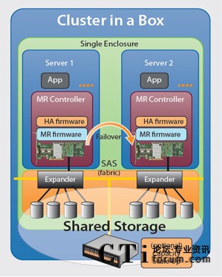 SAS 控制器對每個主板實(shí)現(xiàn)集群化,同時為兩部服務(wù)器提供冗余存儲連接功能。