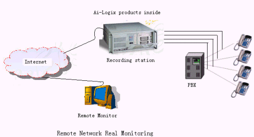 如上圖,在Recording Station 中裝有支持MVIP總線的Ai-Logix系列錄音卡.Recording Station通過Ai-Logix系列錄音卡搭線在被監(jiān)聽的電話線上,采用高阻錄音技術(shù),取得通話的錄音數(shù)據(jù),再由Internet實(shí)時(shí)傳給Remote