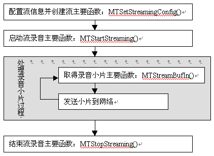 流式錄音的實(shí)現(xiàn)過程包括配置流信息并創(chuàng)建流、啟動(dòng)流錄音、處理錄音小片及結(jié)束流錄音四個(gè)步驟,如下圖: