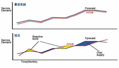 下一代網(wǎng)絡(luò)的IP化、智能化的趨勢,使得服務(wù)路徑從靜態(tài)路由為主向動態(tài)化、共享化轉(zhuǎn)變。這種轉(zhuǎn)變使得主動的網(wǎng)絡(luò)容量規(guī)劃在下一代運(yùn)營環(huán)境中具有更加重要的意義。準(zhǔn)確、真實(shí)、主動的網(wǎng)絡(luò)容量計(jì)劃和趨勢分析能力將成為對OSS解決方案的關(guān)鍵需求。網(wǎng)絡(luò)規(guī)劃不僅可以幫助運(yùn)營商準(zhǔn)確分配網(wǎng)絡(luò)容量,而且可以減少容量不足和失敗訂單,并可通過找出利用率不足的網(wǎng)絡(luò)資源來提高網(wǎng)絡(luò)運(yùn)行效率,如圖3所示。