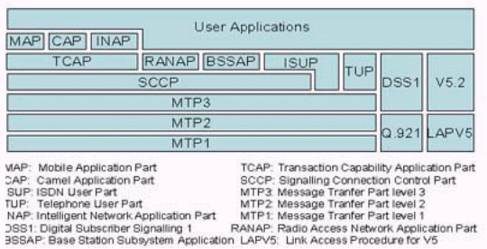 圖中MAP,CAP,RANAP,BSSAP為移動(dòng)通信系統(tǒng)使用的信令;ISUP,TUP,INAP為固定網(wǎng)使用的信令;DSS1和V5.2為接入網(wǎng)使用的信令。