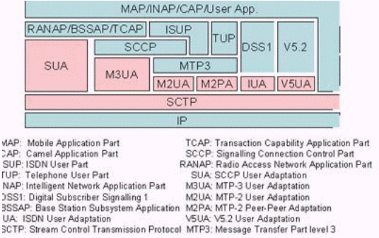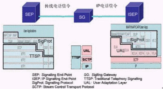 圖中粉紅色部分為SIGTRAN的協(xié)議棧,在它們之上的是對(duì)應(yīng)的電話信令協(xié)議。SIGTRAN的協(xié)議棧分為2層:一層是SCTP,它提供多個(gè)流的,可靠的數(shù)據(jù)傳輸,用戶數(shù)據(jù)的捆綁和分段,阻塞和流量控制,防止"拒絕服務(wù)"和"偽裝"的攻擊等功能。另一層是用戶適配層,圖中由SUA、M3UA、M2UA、M2PA、IUA和V5UA五個(gè)適配模塊所組成,它們分別來滿足各種電話信令協(xié)議適配的要求。