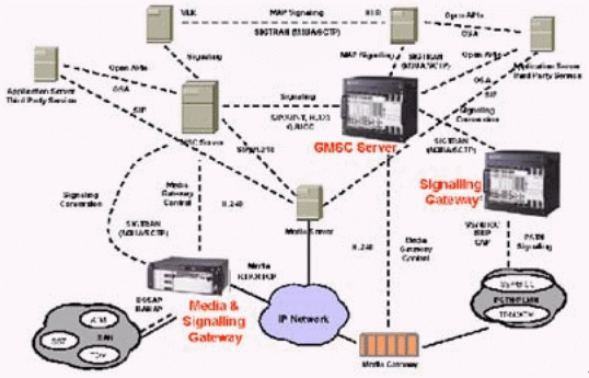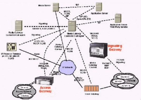 本例中的媒體網(wǎng)關(guān)控制器(MGC)終結(jié)所有的信令,包括直接傳輸?shù)暮屯ㄟ^IP的信令,完成如一個(gè)SIP電話向PSTN網(wǎng)絡(luò)發(fā)送信號(hào)之類的信令互通,還對(duì)打到VoIP網(wǎng)絡(luò)的呼叫進(jìn)行鑒權(quán)和選擇路由,并提供計(jì)費(fèi)信息。這個(gè)MGC還通過SIP/SIP-T,H.323或Q.BICC與其他的MGC通信。