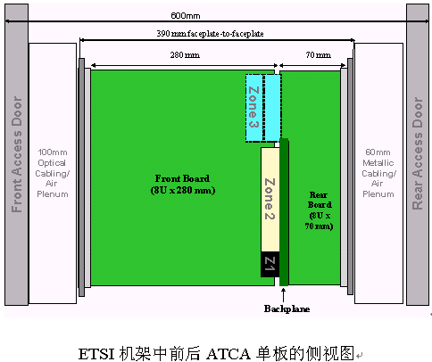 PICMG 3.0機構(gòu)要求主要來自于對600mm ETSI 和19" EIA標準機柜空間使用的研究。PICMG 3.0委員會在考慮單板尺寸能支持下一代元器件對物理和散熱的需求的同時,機箱空間能和板子能達到最大限度的配合和利用。最初的工作是基于歐規(guī)卡的標準,繼而又提升到支持低成本的片狀金屬架構(gòu)(簡單電訊封裝)。對后走線模塊的支持滿足了對后I/O應(yīng)用的需求。在決定可以使用的單板空間時,也充分考慮了前、后板的進深范圍以供大量電纜束綁空間。經(jīng)過對不同規(guī)格尺寸的單板的優(yōu)點進行討論之后,PICMG 3.0組織統(tǒng)一規(guī)格如下:前板 8U x 280mm,進深1.2" pitch,選配后板8U x 70mm深;1.2" pitch,19" EIA機框可以支持14槽,而600mm ETSI的機框可以支持16槽。下圖所示為600mm ETSI機架中的ACTA前后單板的側(cè)視圖:
