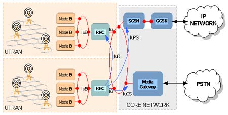 UTRAN為用戶端的移動電話、其它無線設(shè)備(如PDA, 便攜計算機等)提供到有線網(wǎng)絡(luò)的連接,它包括B節(jié)點(Node