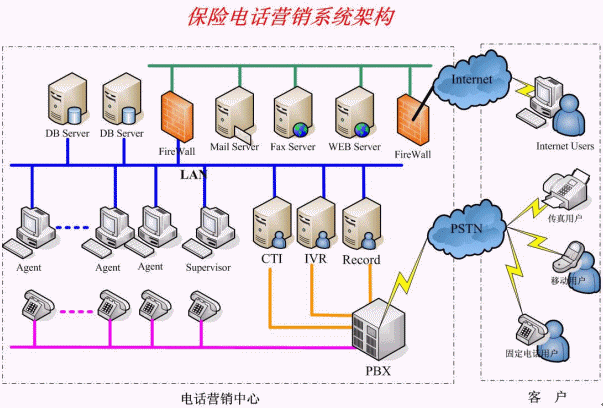 隨著人民生活水平的提高,大家愈發(fā)的重視自己現(xiàn)實及今后的生活質量。而保險作為對大家生活的一種有效保障措施,其受重視程度也達到了一個前所未有的高度。有些人已經(jīng)把保險看作為與汽車、住房并駕齊驅的"新三大件",甚至有人把保險上升為一種生活態(tài)度與生活方式。眾多國外保險公司也看好中國的保險市場,多家外資保險公司進入中國,與國內保險公司共同爭奪這個市場。大環(huán)境的變化對各家保險公司也提出了更高的要求,要求保險公司能夠利用更加高效、便捷的手段為廣大群眾提供更為優(yōu)質的服務,其中用電話進行保險產(chǎn)品的銷售正以其高效率、低成本的優(yōu)勢,受到越來越多的保險公司的關注。保險電話營銷系統(tǒng)架構圖
