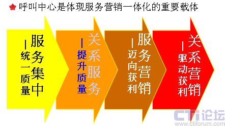 呼叫中心是體現(xiàn)服務(wù)營銷一體化的重要載體。我在前面已經(jīng)說了,服務(wù)和營銷一個(gè)是被動(dòng)一個(gè)是主動(dòng),一個(gè)inbound一個(gè)outbound,呼叫中心可以非常完整地將兩者融合到一起,它是一個(gè)非常重要的服務(wù)營銷的載體。我們從呼叫中心整個(gè)營銷策略的進(jìn)程當(dāng)中,可以看到非常明顯的四個(gè)階段: