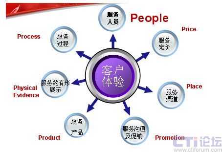 下面這張圖是服務(wù)營銷的7P模型,在這里我認(rèn)為最應(yīng)該關(guān)注的是People——人。這里,我想引用世界經(jīng)理人刊登的一篇文章“影響中國的十大管理理念”上的一段文字:“邁向服務(wù)型經(jīng)濟(jì)實(shí)際上就是邁向人才經(jīng)濟(jì)。在制造業(yè)中,價(jià)值是由機(jī)器創(chuàng)造的。在服務(wù)業(yè)中,價(jià)值則是人創(chuàng)造的!边@也是在服務(wù)業(yè)中,要將“人”進(jìn)行體現(xiàn)。也許你不在乎為你制造產(chǎn)品的工人長的美或丑,但為客戶服務(wù)的人員如果長的很丑,對(duì)服務(wù)就會(huì)有一定的影響。大家只看產(chǎn)品結(jié)果,不關(guān)注過程,但是服務(wù)卻是與過程緊密的結(jié)合。