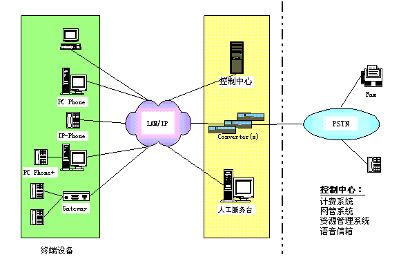 控制中心:包括資源管理系統(tǒng)、計費系統(tǒng)、網管系統(tǒng)、語音信箱。 其中,資源管理系統(tǒng)主要執(zhí)行地址翻譯、權限控制、路由管理等功能;計費系統(tǒng)主要完成計費及結算功能;網管系統(tǒng)完成對網絡及IP PBX運行的維護管理