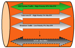 在上例中,在一個千兆端口上,為關鍵性應用ERP預留了嚴格的10%的帶寬資源;為Voice Over IP的應用預留了嚴格的2%的帶寬資源;為低優(yōu)先級的廣播流量預留了最大5%的帶寬資源,……….為HTTP應用僅定義為最為普通的Best Effort。