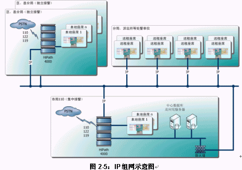 圖 2-5給出了使用純IP實施城市110組網(wǎng)的最普遍的示意。從該圖可以看出,無論采用集中接警還是分散處警,C&CC特別使用于使用純IP技術(shù)實施全市(包括所轄縣級市)110組網(wǎng)?紤]到目前全國公安二、三、四級網(wǎng)建設(shè)日漸成熟,使用純IP技術(shù)實施全市110組網(wǎng)并實現(xiàn)"三警合一"確實是經(jīng)濟(jì)、靈活而方便的選擇,前文提到的芬蘭112全國組網(wǎng)使用的也是這樣的技術(shù)。當(dāng)然,現(xiàn)存的傳統(tǒng)公安通訊專網(wǎng)仍然可以作為備份話務(wù)路由存在。
