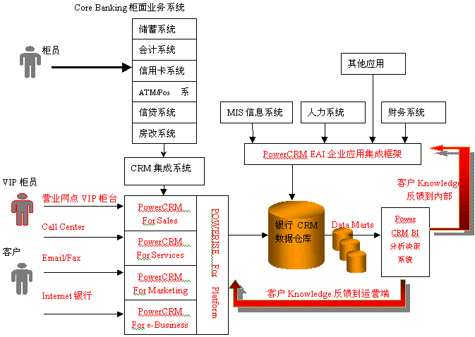 利用PowerCRM的銀行分析型CRM解決方案,對(duì)客戶信息進(jìn)行全面的分析,從而挖掘出許多客戶知識(shí),繼而制定和改進(jìn)相應(yīng)的市場(chǎng)策略,應(yīng)用于PowerCRM運(yùn)營(yíng)型CRM系統(tǒng)中,更好地指導(dǎo)營(yíng)銷(xiāo)人員為客戶服務(wù)和完善客戶服務(wù)流程;同時(shí)也需要反饋到銀行內(nèi)部系統(tǒng),用于增強(qiáng)銀行內(nèi)部的運(yùn)營(yíng)效率。