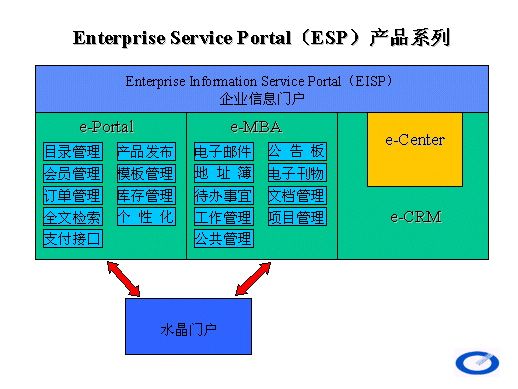 以上軟件產(chǎn)品共同構(gòu)成了瑞尊公司關(guān)于電子商務(wù)時代的幫助企業(yè)進行經(jīng)營、管理的軟件解決方案,ESP -企業(yè)服務(wù)門戶。ESP 可以廣泛應(yīng)用于銀行、保險、電信、電力和生產(chǎn)制造型企業(yè)以及ICP 和政府機關(guān)等。ESP 既可作為一個軟件產(chǎn)品包進行銷售,也可以分成不同產(chǎn)品分別銷售。ESP 不但滿足大中型企業(yè)及政府機構(gòu)的需要,而且將E -Portal 和E -MBA 功能加以融合,推出了針對中小企業(yè)和部門級用戶即裝即用的ESP 普及型產(chǎn)品-水晶門戶。水晶門戶能夠幫助中小企業(yè)快速構(gòu)造各種類型的企業(yè)網(wǎng)站,展示企業(yè)形象、服務(wù)及產(chǎn)品;快速構(gòu)造基于瀏覽器的企業(yè)對內(nèi)信息管理及辦公系統(tǒng),包括文檔管理、郵件、公告板、公共信息等。