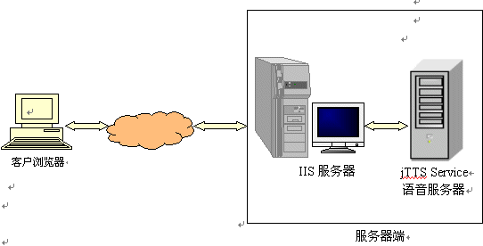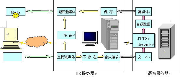 語音服務器方案是指利用捷通華聲在CTI領域成熟應用的jTTS Service語音服務器,增加一臺或多臺語音服務器到現(xiàn)有的IIS服務系統(tǒng)的網(wǎng)絡環(huán)境中;在IIS服務器中,增加訪問語音服務器的功能。當IIS服務器需要流媒體輸出時,向語音服務器發(fā)出請求,語音服務器接受IIS服務器的請求,并對請求的數(shù)據(jù)進行合成、格式轉(zhuǎn)換,得到流媒體后返回給IIS服務器,IIS服務器再將此流媒體傳輸給用戶。