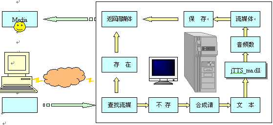 瀏覽器端(Explorer)發(fā)出瀏覽請求,網(wǎng)站服務器(IIS)根據(jù)請求查找流媒體(音頻流)文件,如有,則將流媒體返回客戶端,并啟動客戶端的MS media player播放流媒體。若沒有,則向語音服務器(jTTS Service)發(fā)出合成請求,并將所需合成的文本通過Socket接口傳送至語音服務器;語音服務器響應網(wǎng)站服務器的合成請求后,將調(diào)用jTTS合成技術進行語音合成,并調(diào)用WMF SDK將生成的音頻文件轉(zhuǎn)換成流媒體格式ASF;通過Socket接口返回IIS服務器端后,將此流媒體文件存儲到指定的Web目錄,同時將流媒體返回瀏覽器端,啟動MS media player播放。其流程如下: