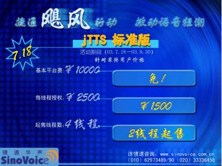 2003年7月18日,北京捷通華聲語音技術有限公司正式發(fā)布捷通華聲語音合成技術 “jTTS標準版”。為慶祝“jTTS標準版”的正式上市,為期近三個月,推廣“jTTS標準版”的捷通“颶風行動”也在同一時間正式啟動! 捷通“颶風行動”的宗旨--用全新的產(chǎn)品、全方位的服務、最具競爭力的價格與所有CTI領域的企業(yè)合作,開啟面向中小型CTI系統(tǒng)語音應用的市場大門,為CTI產(chǎn)業(yè)發(fā)展提供持久動力支持!