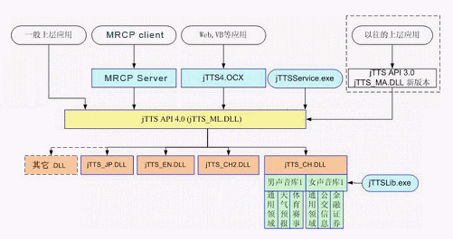 Programming Interface),即jTTS API 4.0,以及統(tǒng)一的多語(yǔ)種引擎管理模塊,即jTTS_ML.DLL。多語(yǔ)種的引擎(例如中文引擎jTTS_CH.DLL,英文引擎jTTS_EN.DLL等)在多語(yǔ)種引擎管理模塊的調(diào)度下進(jìn)行實(shí)際的合成工作,而目前尚未提供的其他語(yǔ)種的引擎也可以方便地加入到這個(gè)體系結(jié)構(gòu)中來。