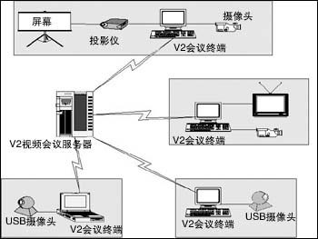 V2 Conference 視頻會議系統(tǒng)是基于MPEG-4標(biāo)準(zhǔn)的多媒體壓縮技術(shù),利用IP網(wǎng)絡(luò)開展視頻會議的軟件系統(tǒng)。在從56Kbps撥號到寬帶的網(wǎng)絡(luò)環(huán)境下,用戶利用V2 Conference視頻會議平臺,通過配備普通的PC機、標(biāo)準(zhǔn)的音視頻采集和輸出設(shè)備,就可以實現(xiàn)基于Intranet/Internet的虛擬會議。系統(tǒng)不僅可以提供流暢的語音,而且提供清晰流暢的視頻圖像。與傳統(tǒng)的基于硬件的解決方案相比,V2 Conference 是純軟件解決方案。用戶無需投入高昂的成本,就能夠?qū)崿F(xiàn)高質(zhì)量、高可靠性的音視頻通訊、協(xié)同工作、文檔共享、遠(yuǎn)程會議管理等多種會議功能,有效地節(jié)約時間和經(jīng)費,提高企業(yè)的工作效率。典型應(yīng)用示意圖
