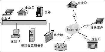 ● Conference可以滿足企業(yè)用戶桌面和會議室級別會議的需求,并且在一個系統(tǒng)中,可以同時進行多個會議而互不干擾,使應(yīng)用更加方便,典型的應(yīng)用示意圖如下所示: