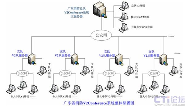 根據(jù)整目前廣東省消防部隊(duì)網(wǎng)絡(luò)整體部署在全省公安網(wǎng)絡(luò)基礎(chǔ)之上,已經(jīng)全部接入公安網(wǎng)絡(luò),所以V2 Conference系統(tǒng)也構(gòu)建在這個(gè)網(wǎng)絡(luò)平臺(tái)之上,如下所示: