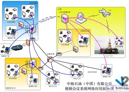 中海石油(中國)有限公司V2 Conference系統(tǒng)網(wǎng)絡(luò)應(yīng)用拓撲圖: