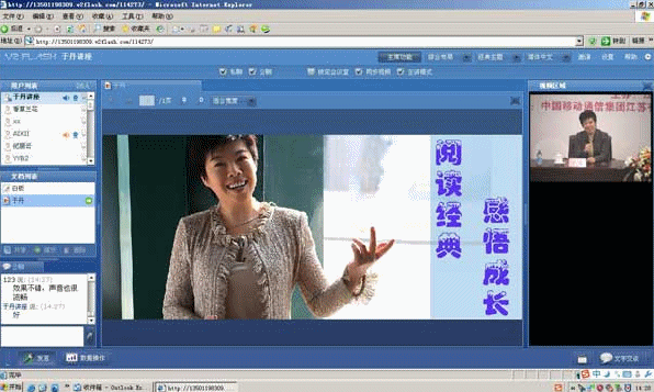 CTI論壇(ctiforum)1月21日消息(記者 張塵):2010年1月14日,江蘇省女性大講堂2010年第一集----于丹“閱讀經(jīng)典,感悟成長”專題講座在中國移動江蘇綜合廳成功舉行。據(jù)悉,《閱讀經(jīng)典 感悟成長》是“全球通VIP名家講堂”聯(lián)手于丹推出的全國大型巡講式講堂,已先后在深圳、上海、蘭州、泉州、武漢、合肥等地進(jìn)行了講演。截止目前,全球通已成功舉辦“全球通VIP大講堂”25場,參與人數(shù)累計達(dá)上萬人次,先后邀請到了李肇星、張召忠、紀(jì)連海等專家學(xué)者擔(dān)任主講嘉賓。V2 Flash視頻會議系統(tǒng)