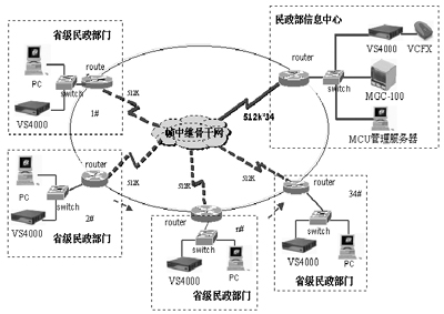 系統(tǒng)骨干網(wǎng)絡(luò)為民政廣域網(wǎng),該網(wǎng)提供512Kbps帶寬(幀中繼)的傳輸信道。整個系統(tǒng)以北京總部為中心,覆蓋全國37個省、自治區(qū)、直轄市以及計劃單列市的民政部門,成為電子政務(wù)標(biāo)志性工程——“數(shù)字民政”的一個重要組成部分。
