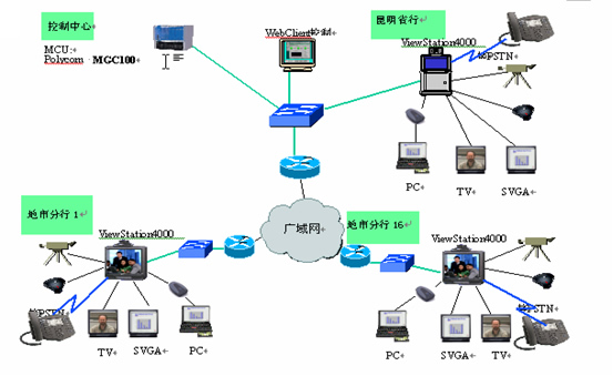 云南省中國銀行主會場放置1臺MGC-100 MCU和1臺視訊會議終端ViewStation4000,1套雙流模塊;其他16個地市各放置1臺視訊會議終端ViewStation4000,1套雙流模塊。MCU和視訊終端通過以太網(wǎng)交換機接入傳輸網(wǎng)絡,根據(jù)各分地市網(wǎng)絡實際帶寬,視頻會議的帶寬定為2M。