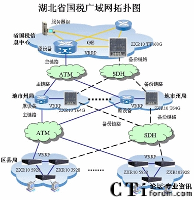 湖北省國稅三級專網(wǎng)已經(jīng)建成,但是存在單點單鏈路隱患,為了保證網(wǎng)絡(luò)可靠運行,2006年湖北國稅攜手中興通訊對省國稅系統(tǒng)的網(wǎng)絡(luò)進(jìn)行備份網(wǎng)絡(luò)改造,結(jié)合稅務(wù)系統(tǒng)金稅三期網(wǎng)絡(luò)需求,網(wǎng)絡(luò)改造采用SDH線路來組建高帶寬的廣域網(wǎng)絡(luò),同時與原有的網(wǎng)絡(luò)設(shè)備(包括路由器、交換機(jī))及網(wǎng)絡(luò)接入設(shè)備實現(xiàn)互連互通,互為備份。