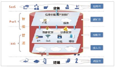 云化的智能管道如圖1所示,包括桌面云->接入云->控制云->感知云->應(yīng)用云,實(shí)際上是端管云一體化的網(wǎng)絡(luò)架構(gòu),建立一個(gè)可以自感知、自學(xué)習(xí)、自組織、自適配、自管理的數(shù)字神經(jīng)網(wǎng)絡(luò),提供云化的不同層次業(yè)務(wù)。