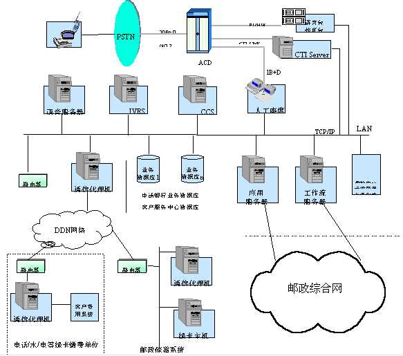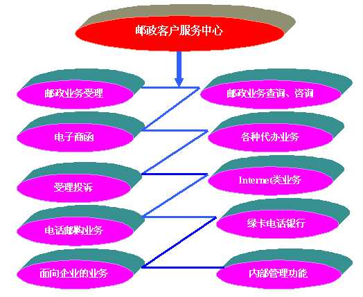 郵政呼叫中心在現(xiàn)有郵政綜合網(wǎng)的基礎(chǔ)上,利用電話服務(wù)廣泛普及,方便快捷的優(yōu)點,采用CTI技術(shù),把綜合網(wǎng)提供的諸多并行的多種業(yè)務(wù)無縫集成,為綜合網(wǎng)提供一個集成多種服務(wù)功能為一體的橫向服務(wù)。
