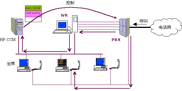 在任何一個(gè)步驟中,如客戶選擇了人工坐席,則IVR請求CCM根據(jù)多種情況選擇一個(gè)空閑坐席(選擇方法見下文)并控制PBX將呼叫與選擇的人工坐席接通,同時(shí)系統(tǒng)在客戶對IVR操作的過程中,已經(jīng)幀測到了客戶所使用的電話號碼、客戶的按鍵信息,系統(tǒng)還記錄有客戶上次的呼叫情況等數(shù)據(jù),這些數(shù)據(jù)基本上可以確定客戶大體關(guān)心的問題,對于老客戶甚至可以初步認(rèn)定呼叫者的身份、年齡、性別、業(yè)務(wù)辦理情況等,因此,話務(wù)員在與客戶談話之前就已經(jīng)了解了相當(dāng)多的信息,并控制選定的坐席屏幕顯示有關(guān)客戶信息,便于直接進(jìn)入正題,提高了效率?蛻襞c坐席的交流過程中,坐席可通過終端請求CCM控制PBX將本次呼叫與其他話務(wù)員(坐席)、專家或業(yè)務(wù)辦公室(如內(nèi)線電話)等接通,當(dāng)坐席人員將呼叫轉(zhuǎn)移到另一坐席或?qū)<視r(shí),系統(tǒng)將在本呼叫中收集的各類數(shù)據(jù)同時(shí)轉(zhuǎn)向下一坐席電腦。在坐席人員解答客戶問題時(shí),可將問題及解答情況收集,便于分析坐席人員的業(yè)務(wù)素質(zhì)和問題傾向,從而有針對性地培訓(xùn)坐席人員。對于客戶來講,他可以通過電話按鍵在話務(wù)員、自動語音、傳真、專家和業(yè)務(wù)辦公室之間漫游,系統(tǒng)將記錄客戶漫游的路徑,對于設(shè)計(jì)較好的菜單和路經(jīng)來說,客戶的漫游路徑基本上可以反映出其需求,大量客戶的漫游路徑無疑將反映出市場需求。