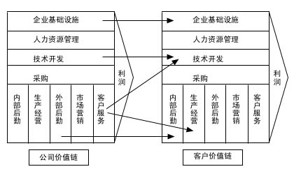 企業(yè)的主要活動都是具有相應價值的,這些活動構成了企業(yè)的價值鏈,企業(yè)價值鏈首先表現(xiàn)為企業(yè)內(nèi)部的聯(lián)系和支撐,各種活動相互配合,才能產(chǎn)生價值和利潤;其次,企業(yè)的活動和上游供貨商和下游用戶緊密聯(lián)系,相互影響。顯然,供貨商、用戶的各種活動方式能夠直接或者間接地影響企業(yè)的成本、利潤和競爭優(yōu)勢,同樣,企業(yè)的各種活動也將對它們產(chǎn)生很大的影響。