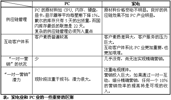 聯(lián)想長(zhǎng)期構(gòu)筑的、在中國(guó)PC制造業(yè)的核心競(jìng)爭(zhēng)力,正受到戴爾的巨大威脅,導(dǎo)致聯(lián)想開始轉(zhuǎn)而采用戴爾的按客戶需求定制、直接銷售的模式,希望建立新的核心競(jìng)爭(zhēng)力,再度引領(lǐng)中國(guó)PC產(chǎn)業(yè)。IT制造業(yè)的巨變,戴爾的成功給陷于低層次競(jìng)爭(zhēng)的家電產(chǎn)業(yè)很大的啟發(fā),曾經(jīng)鑄造中國(guó)家電企業(yè)輝煌的核心競(jìng)爭(zhēng)力急需注入新的生命力,以適應(yīng)新的競(jìng)爭(zhēng)形勢(shì)。計(jì)算機(jī)技術(shù)、互動(dòng)通信技術(shù)的進(jìn)步以及互聯(lián)網(wǎng)的出現(xiàn)使企業(yè)能夠建立與用戶之間一對(duì)一的密切客戶關(guān)系,使服務(wù)創(chuàng)造價(jià)值,IT技術(shù)推動(dòng)技術(shù)、產(chǎn)品、生產(chǎn)、銷售和營(yíng)銷的發(fā)展,支撐家電企業(yè)建立新的核心競(jìng)爭(zhēng)力。在同質(zhì)化競(jìng)爭(zhēng)的環(huán)境下,家電企業(yè)也許更應(yīng)該從服務(wù)、營(yíng)銷、銷售方面來(lái)建立自己的核心競(jìng)爭(zhēng)力。海爾就是典型的例子,海爾的發(fā)展與它完善的服務(wù)體系和服務(wù)制度是分不開的。聚焦于服務(wù)、營(yíng)銷、銷售的客戶關(guān)系管理(CRM)系統(tǒng)讓家電企業(yè)看到了新的希望?梢灶A(yù)言,CRM將為家電業(yè)點(diǎn)燃一盞新啟航燈。