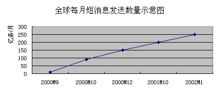 。。2001年全球的短消息服務(wù)業(yè)得到了迅猛的發(fā)展,全球共發(fā)送短消息2000億條。在中國短消息服務(wù)市場中,中國移動在2001年發(fā)送短消息159億條,中國聯(lián)通發(fā)送短消息30億條。隨著中國移動和中國聯(lián)通之間的互聯(lián)互通,中國短消息市場在2002年將達(dá)到300億條。并且中國電信和中國網(wǎng)通也加入到此市場中,中國固話短消息也將在此市場中占有一席之地。 中國的移動用戶在2002年4月已經(jīng)到了1.6億戶,并且還在以500萬戶/月的速度發(fā)展,估計(jì)到2005年中國的移動用戶將達(dá)到4.5億戶,中國手機(jī)用戶在35歲以下的占80%左右,他們是使用短消息的主體人群,因此中國移動短消息具有非常大的發(fā)展?jié)摿Α?/p>