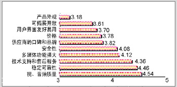用戶認(rèn)為重要性一般但偏向重要3.5≤Y<4的指標(biāo)有供應(yīng)商的口碑、價(jià)格、用戶界面友好易用、可拓展升級(jí)四項(xiàng)。十項(xiàng)指標(biāo)中消費(fèi)者最低的也是評(píng)價(jià)重要性一般3≤Y<3.5的指標(biāo)是產(chǎn)品外觀。視頻會(huì)議終端系統(tǒng)界面的友好易用、供應(yīng)商的口碑等相對(duì)視音頻質(zhì)量、穩(wěn)定可靠性、安全性等指標(biāo)而言,重要性稍弱,這反映用戶對(duì)系統(tǒng)的要求趨于實(shí)際應(yīng)用的高效。而價(jià)格指標(biāo)重要性僅排在十項(xiàng)指標(biāo)測評(píng)的第七位,反映用戶對(duì)于視頻會(huì)議系統(tǒng)產(chǎn)品的價(jià)格敏感度不高,用戶在選購產(chǎn)品時(shí),首先看重的是產(chǎn)品功能質(zhì)量性能。出于這一消費(fèi)傾向,用戶對(duì)于產(chǎn)品外觀重要性評(píng)價(jià)也自然偏低。