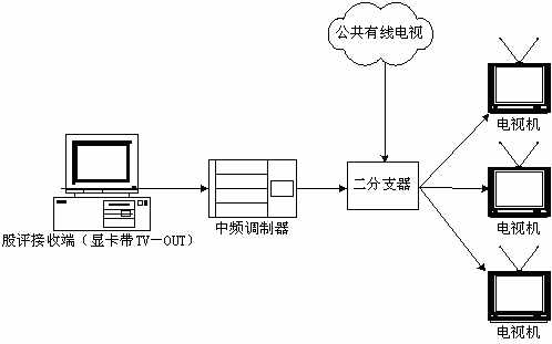 本系統(tǒng)接收端接收實(shí)時(shí)廣播時(shí),除了用普通PC機(jī)收看,或把PC機(jī)接收到的信號(hào)輸?shù)诫娨暎ù笃粒┥鲜湛,甚至還可以接入有線(xiàn)電視網(wǎng)進(jìn)行播放。具體方法是通過(guò)一個(gè)接收端接收股評(píng)節(jié)目,通過(guò)帶TV-OUT的顯卡把TV信號(hào)輸出到中頻調(diào)制設(shè)備,中頻調(diào)制設(shè)備可以把基帶模擬信號(hào)轉(zhuǎn)換成一個(gè)有線(xiàn)電視信號(hào),且傳輸距離遠(yuǎn),損失小,再把這個(gè)信號(hào)與有線(xiàn)電視信號(hào)一起接入一個(gè)二分支器(2進(jìn)1出),這就可以和公共有線(xiàn)電視共存,形成自己的頻道,供電視接收。