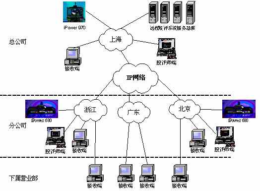 某證券公司有三級(jí)網(wǎng)絡(luò),總公司、分公司和下屬營(yíng)業(yè)部?偣镜椒止編捠2M,在總公司配置一套會(huì)議室型電視會(huì)議終端POLYCOM 970和一套多點(diǎn)會(huì)議服務(wù)器Radvision ViaIP400。在分公司配置了38套會(huì)議室型電視會(huì)議終端POLYCOM 680,用于與總公司進(jìn)行雙向視頻會(huì)議。分公司到營(yíng)業(yè)部帶寬是512K,各營(yíng)業(yè)部安裝遠(yuǎn)程股評(píng)系統(tǒng)接收端程序,遠(yuǎn)程股評(píng)系統(tǒng)服務(wù)器都放置在海通總公司。當(dāng)在總公司進(jìn)行股評(píng)時(shí),總公司本地?cái)z像頭拍攝教師畫(huà)面,MIC采集教師聲音,傳給服務(wù)器編碼,再通過(guò)網(wǎng)絡(luò)供各個(gè)接收端接收;當(dāng)在分公司進(jìn)行股評(píng)時(shí),首先分公司的電視會(huì)議設(shè)備采集教師畫(huà)面及聲音傳回總公司的電視會(huì)議設(shè)備,再傳給遠(yuǎn)程股評(píng)系統(tǒng)的服務(wù)器進(jìn)行編碼,然后通過(guò)網(wǎng)絡(luò)發(fā)布,供接收端接收。(結(jié)構(gòu)如下圖)