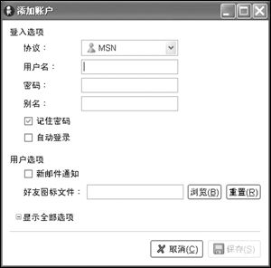 輸入用戶信息:接下來(lái),依次輸入MSN(或ICQ等)的用戶名和密碼,注意用戶名要輸入完整,至于“別名”當(dāng)然是你的昵稱啦。如果你不希望下一次登錄時(shí)再輸入密碼的話,可以選中“記住密碼”和“自動(dòng)登錄”復(fù)選框。