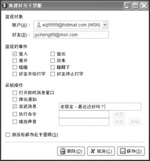 MSN可以在好友登錄時(shí)設(shè)置提示,但卻無(wú)法像QQ一樣自動(dòng)發(fā)出特定問候,這未免有些遺憾。在Gaim中,我們可以為那些暫時(shí)不在線的好友添加千里眼監(jiān)視功能(如圖3),這里可以監(jiān)視的事件包括登入、登出、離開、回來(lái)、瞌睡、睡醒了、好友開始打字、好友停止打字等等,而可以設(shè)置的提示方式是打開即時(shí)消息窗口、彈出通知、發(fā)送消息、執(zhí)行命令、播放聲音等等,非常豐富!