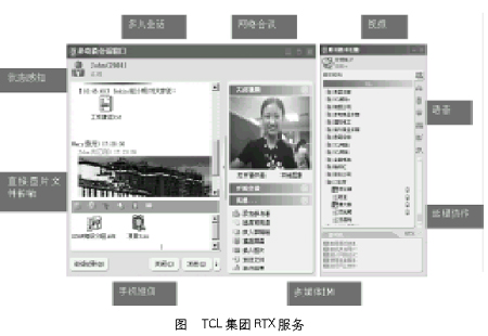RTX產(chǎn)品支持標準的SIP、H.323 IP電話協(xié)議,并采用高質量的QoS技術保證實時通信網(wǎng)絡質量,使得TCL集團公司的用戶可以與同事之間采用語音或者視頻的面對面的交流(如圖),相當于給集團公司的任何一位RTX用戶配備了一部集成的視頻和語音電話。目前這項服務在集團公司非常受歡迎,尤其是遠程的代表處和集團總部之間的信息交流更直接、更快捷,在一定程度上取代了電話的功能,大大節(jié)約了通信費用。比如,TCL空調(diào)的計劃部每天需要和全國20多個代表處的計劃處進行數(shù)據(jù)往來,以前需要電話完成的功能現(xiàn)在通過RTX的即時文字、短信和語音對講完成,大大提高效率,節(jié)省了通信成本。