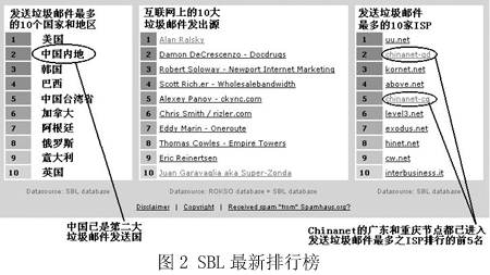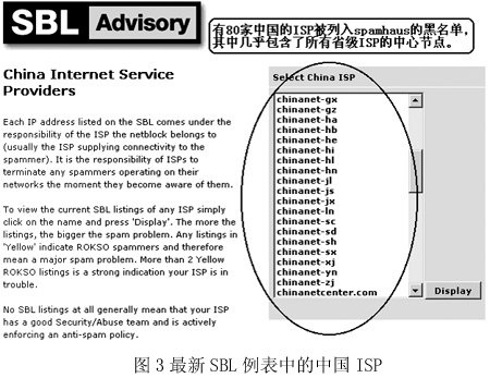 圖2是國際上著名的反垃圾郵件組織Spamhaus在網(wǎng)站上列出的統(tǒng)計(jì)排行榜,“China”已經(jīng)穩(wěn)居第二大垃圾郵件發(fā)送國的位置,而右邊的一個(gè)排行榜則從另一個(gè)角度向我國敲響了警鐘——在專為發(fā)送垃圾郵件的ISP所列的黑名單SBL中,我國Chinanet的兩個(gè)省級(jí)ISP在前10名中分列第2和第5名。而Chinanet作為中國的公用信息互聯(lián)網(wǎng)絡(luò),是我國的Internet骨干網(wǎng),是國內(nèi)用戶接入互聯(lián)網(wǎng)的主要途徑之一!拔覀冋娌幌M赃@樣的方式‘揚(yáng)名海外’”,來自一家ISP的一位不肯透露姓名的女士說,“其實(shí)我們也是受害者!”