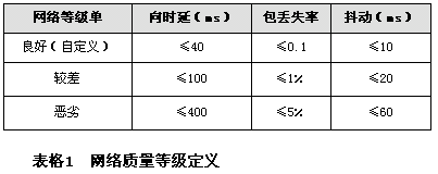 描述承載網(wǎng)性能指標(biāo)的參數(shù)主要有帶寬、時延、時延抖動、丟包率等,其中帶寬是一個基本要求,必須滿足規(guī)劃的帶寬要求。根據(jù)通信行業(yè)標(biāo)準(zhǔn)YD/T1071-2000《IP電話網(wǎng)關(guān)設(shè)備技術(shù)要求》,網(wǎng)絡(luò)質(zhì)量可以分為以下三級: