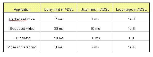 本節(jié)以ADSL承載的幾種典型業(yè)務(wù)為例,討論如何保證不同應(yīng)用的QoS要求。為保證不同應(yīng)用的QoS要求,ADSL設(shè)備可通過對不同的業(yè)務(wù)進(jìn)行分級,以Diffserv的方式提供不同的分級所需的QoS質(zhì)量。例如可將語音業(yè)務(wù)(VoIP)和視頻會議設(shè)為最高優(yōu)先級,廣播視頻業(yè)務(wù)設(shè)為較高優(yōu)先級,其他如Web瀏覽等業(yè)務(wù)設(shè)為低優(yōu)先級。ADSL設(shè)備為每個優(yōu)先級設(shè)立獨(dú)立的隊(duì)列,然后采用嚴(yán)格優(yōu)先級或帶有權(quán)重的循環(huán)機(jī)制控制各優(yōu)先級隊(duì)列的輸出。通過調(diào)整不同優(yōu)先級隊(duì)列的buffer大小和最長留駐時間,可滿足不同應(yīng)用對時延、抖動、包丟失率的不同要求。
