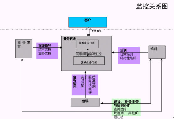 呼叫中心的質量管理涉及到如下幾個方面,一、座席人員的話務質量;二、各項質量運營指標的實現(xiàn)情況;三、客戶的滿意度指標。在本部分內(nèi)容中,重點討論話務人員的話務質量控制。