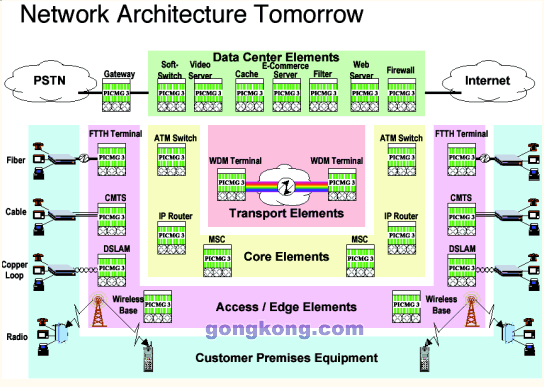 AdvancedTCA的設計目的就是作為電信應用的高級計算平臺,因此AdvancedTCA可以作為通用計算平臺在各種各樣的電信行業(yè)應用中找到自己的位置,如下圖所示: