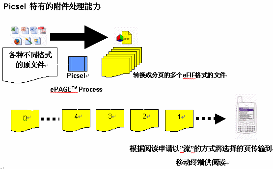 在計算機上的電子郵件的各種格式文件附件無需任何特殊處理、無需同步和轉(zhuǎn)換可以在移動終端上閱讀。并且電子郵件的附件可以被進(jìn)一步壓縮使其通過網(wǎng)絡(luò)下載更為經(jīng)濟(jì),壓縮后服務(wù)器將文件以"流"傳送,這意味著用戶無需等待一個多頁的文件完全下載完畢后再閱讀,可以選擇任何一頁下載閱讀。
