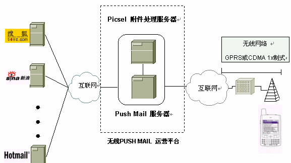 對于擁有便攜式計算機的用戶,在移動中,通過對其計算機進(jìn)行相應(yīng)的軟、硬件的配置,根據(jù)其所在地的可利用的資源,可以開啟便攜式計算機借助于GPRS、CDMA1x、WiFi無線或有線寬帶和撥號等手段上網(wǎng)訪問其EMAIL。而在沒有便攜式計算機或計算機關(guān)閉的情況下,PUSH MAIL系統(tǒng)可以在GPRS和CDMA1x廣泛的覆蓋范圍內(nèi)主動地將您的EMAIL"推"送到您的手機上,手機在接收到EMAIL后會發(fā)出提示音,使用戶可以在第一時間及時地閱讀到您的EMAIL及其附件。